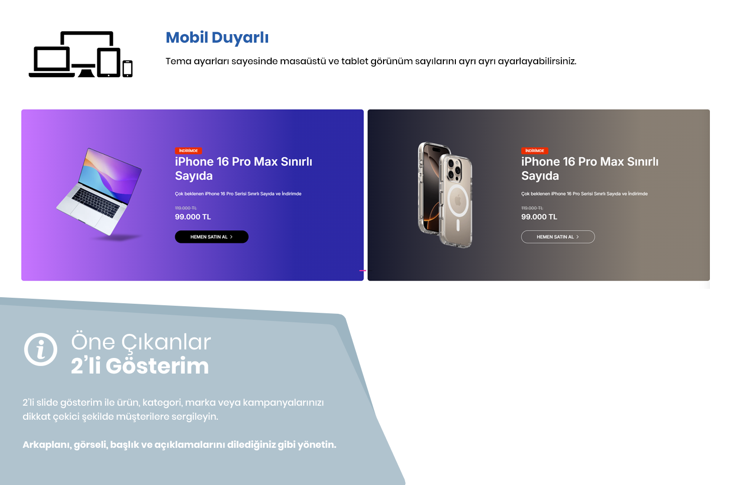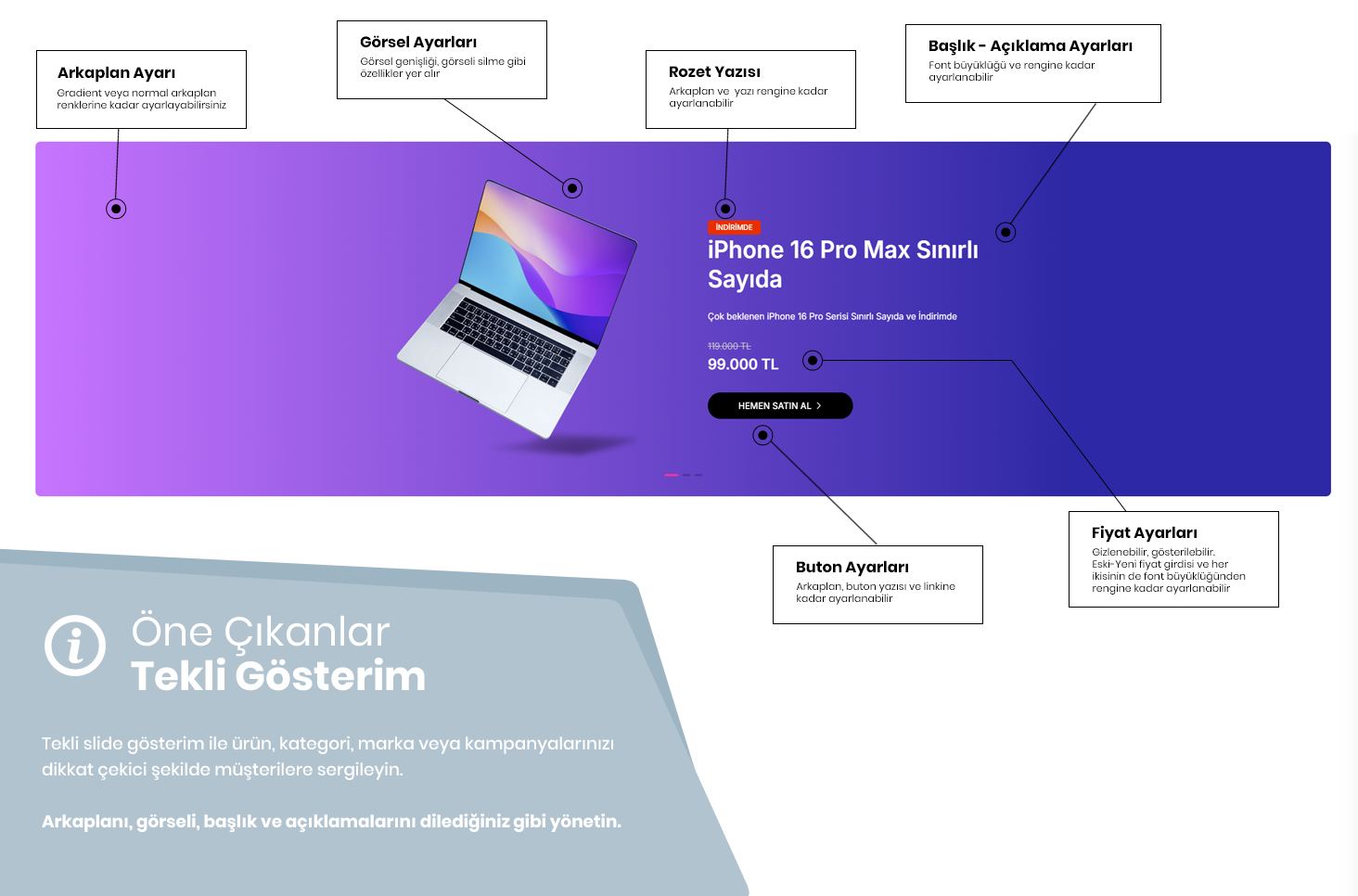 E-ticaret sitenizi güçlendirin! Müşterilerinizin dikkatini çekecek Öne Çıkanlar Modülü ile ürünlerinizi, kampanyalarınızı, duyurularınızı veya kategori bilgilerinizi etkileyici ve etkili bir şekilde tanıtabilirsiniz. Daha fazla görünürlük, daha fazla etkileşim, daha fazla satış! Bu modül sayesinde vitrininizi en cazip şekilde düzenleyebilir, müşterilerinizin ilgisini tam da istediğiniz noktalara yönlendirebilirsiniz. Esnek tasarım ve kolay kullanım özellikleriyle öne çıkanlar modülü, işletmenizin dijital görünümü ve pazarlamasına doğrudan fayda sağlar.
