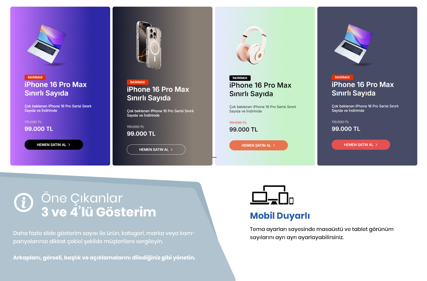 - Slider bazlı Başlık, Kısa Açıklama, Fiyat ve Rozet yazıları için yazı renklerini belirleme