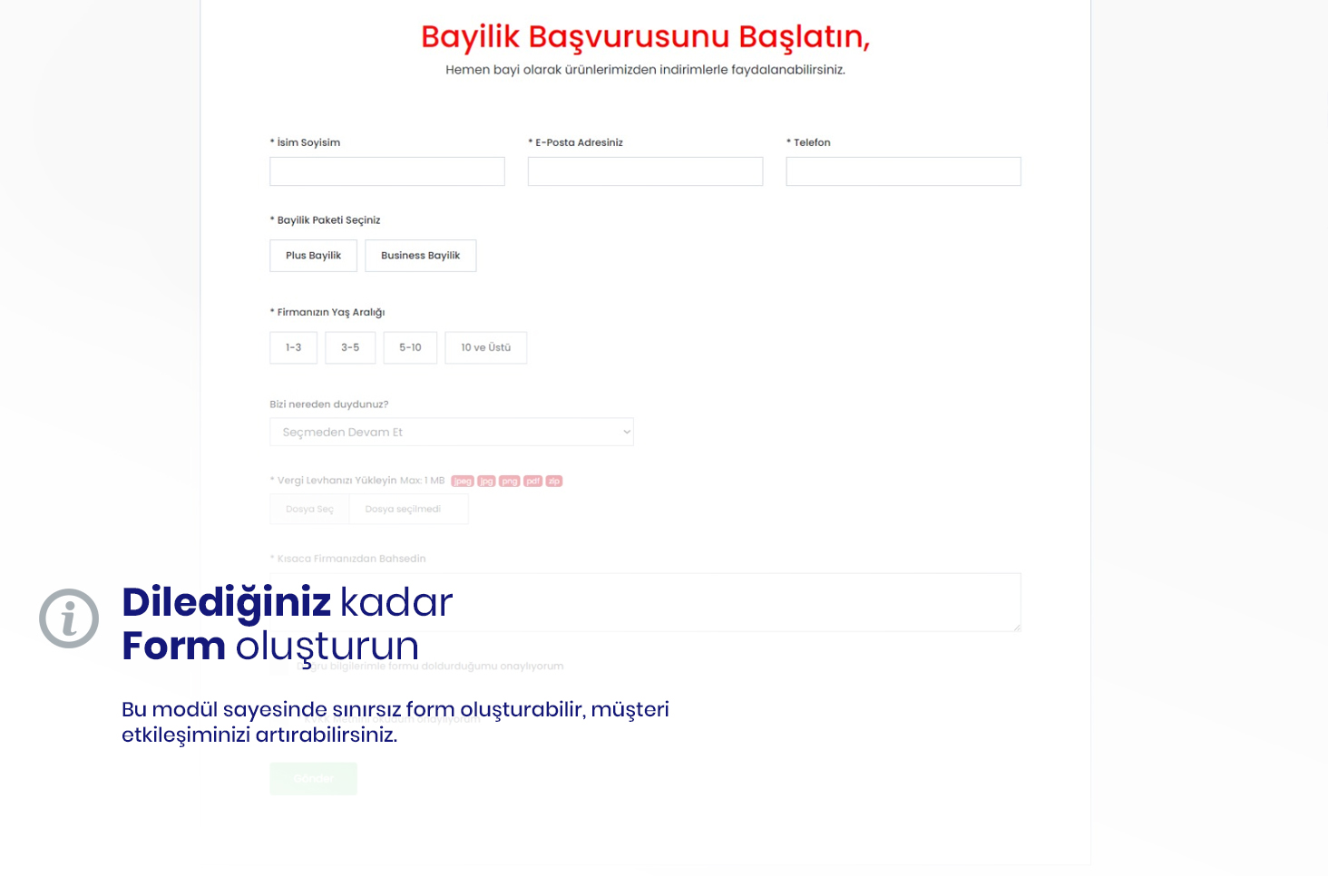 Sınırsız form oluşturma modülü ile e-ticaret sitenizde ihtiyacınıza uygun özel formlar tasarlayın. Input, textarea, checkbox, radio butonları, dosya yükleme ve select gibi alanları sınırsızca ekleyerek esnek form çözümleri sunun. E-ticaret yazılımınıza kolayca entegre edin ve müşteri etkileşimini artırın. phptema güvencesiyle, işinizi bir adım öne taşıyın!