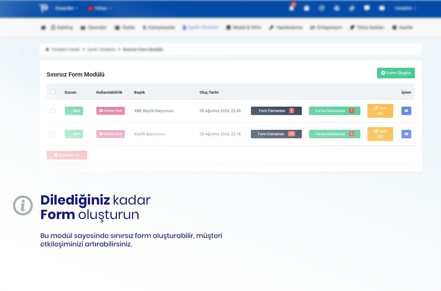 - Üyelere Özel veya Herkese Açık formlar oluşturabilirsiniz.